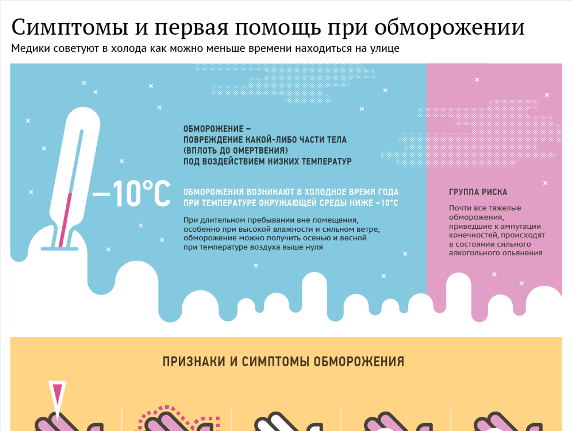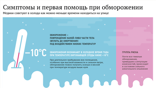 Медики советуют во время холодов как можно меньше времени находиться на улице. Обморожение может возникнуть уже при температуре окружающей среды ниже –10°С. В особой группе риска находятся любители спиртного – почти все тяжелые обморожения, приведшие к ампутации конечностей, происходят в состоянии сильного алкогольного опьянения. Но и ответственным гражданам расслабляться не стоит. Рекомендации по поведению при первых признаках обморожения смотрите в инфографике Sputnik.