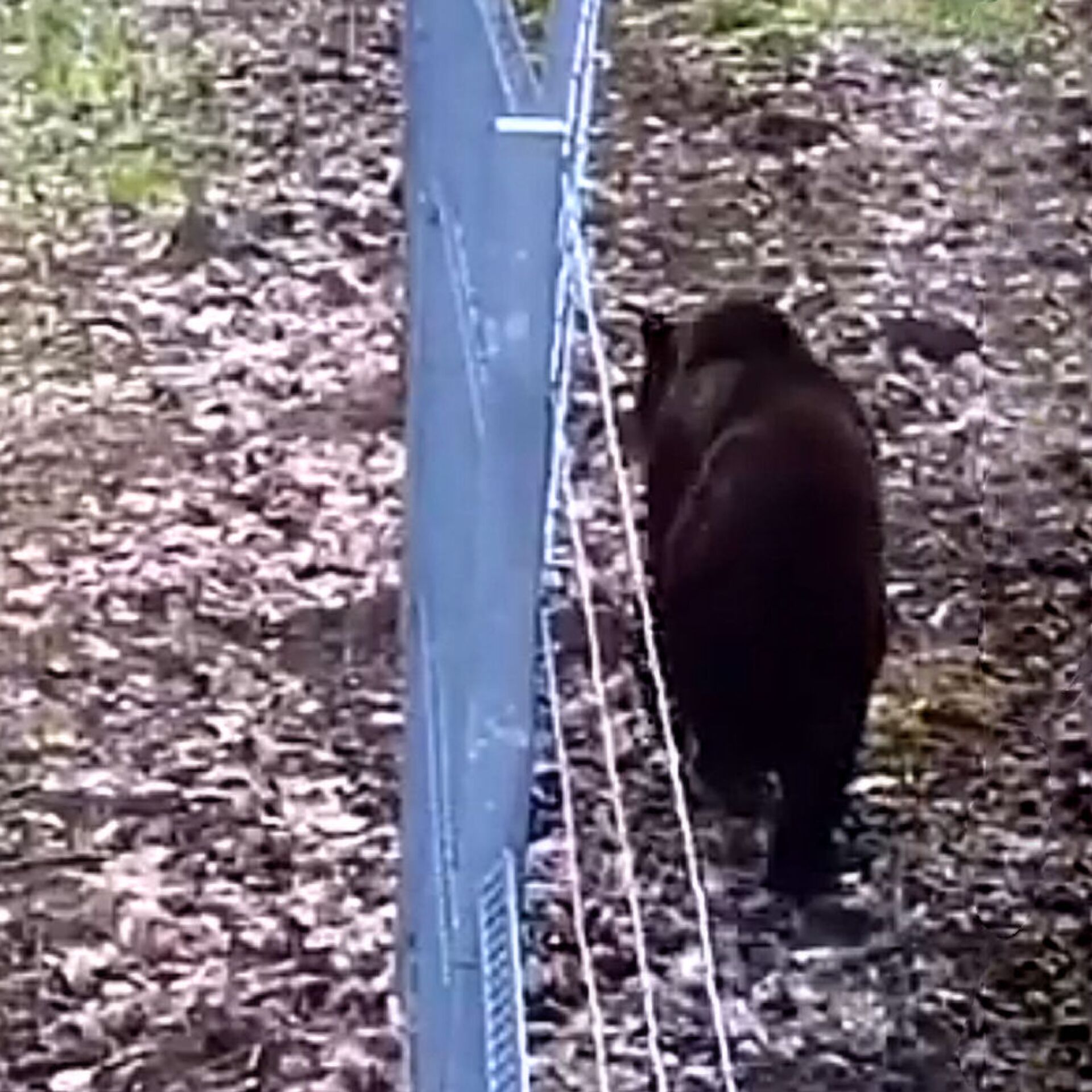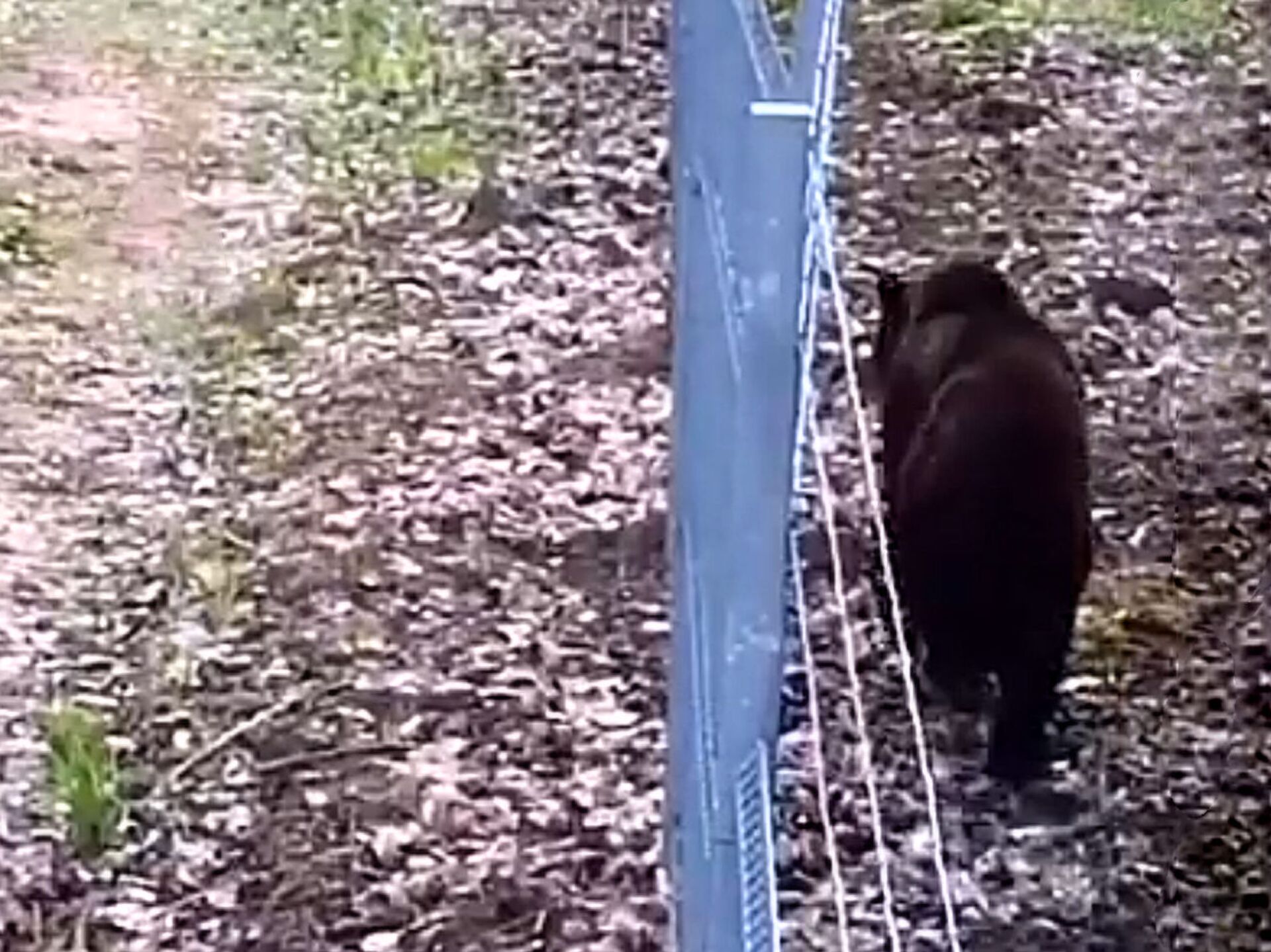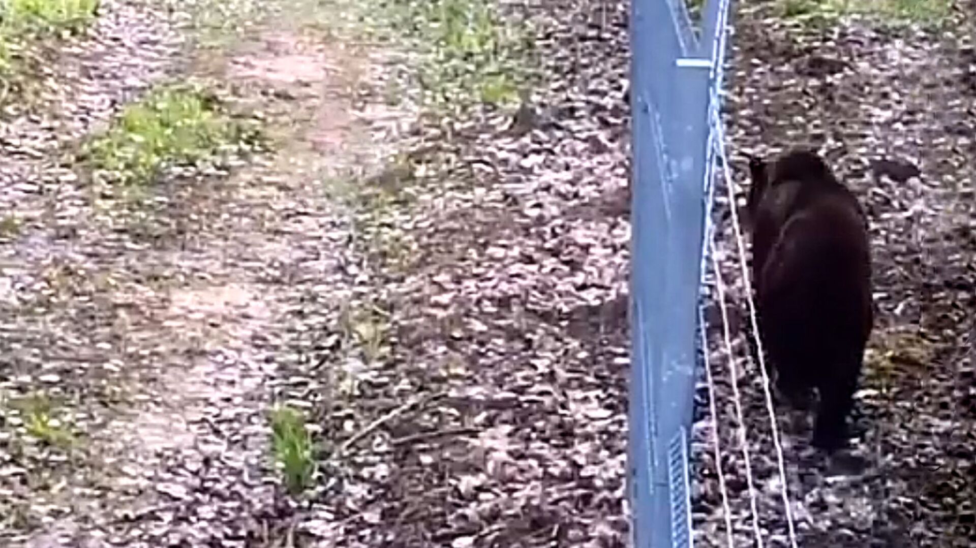 На кадрах видно, как животное сначала спокойно прогуливается вдоль забора. Затем медведь "атакует" преграду, но после единственной неудачной попытки уходит в сторону леса.