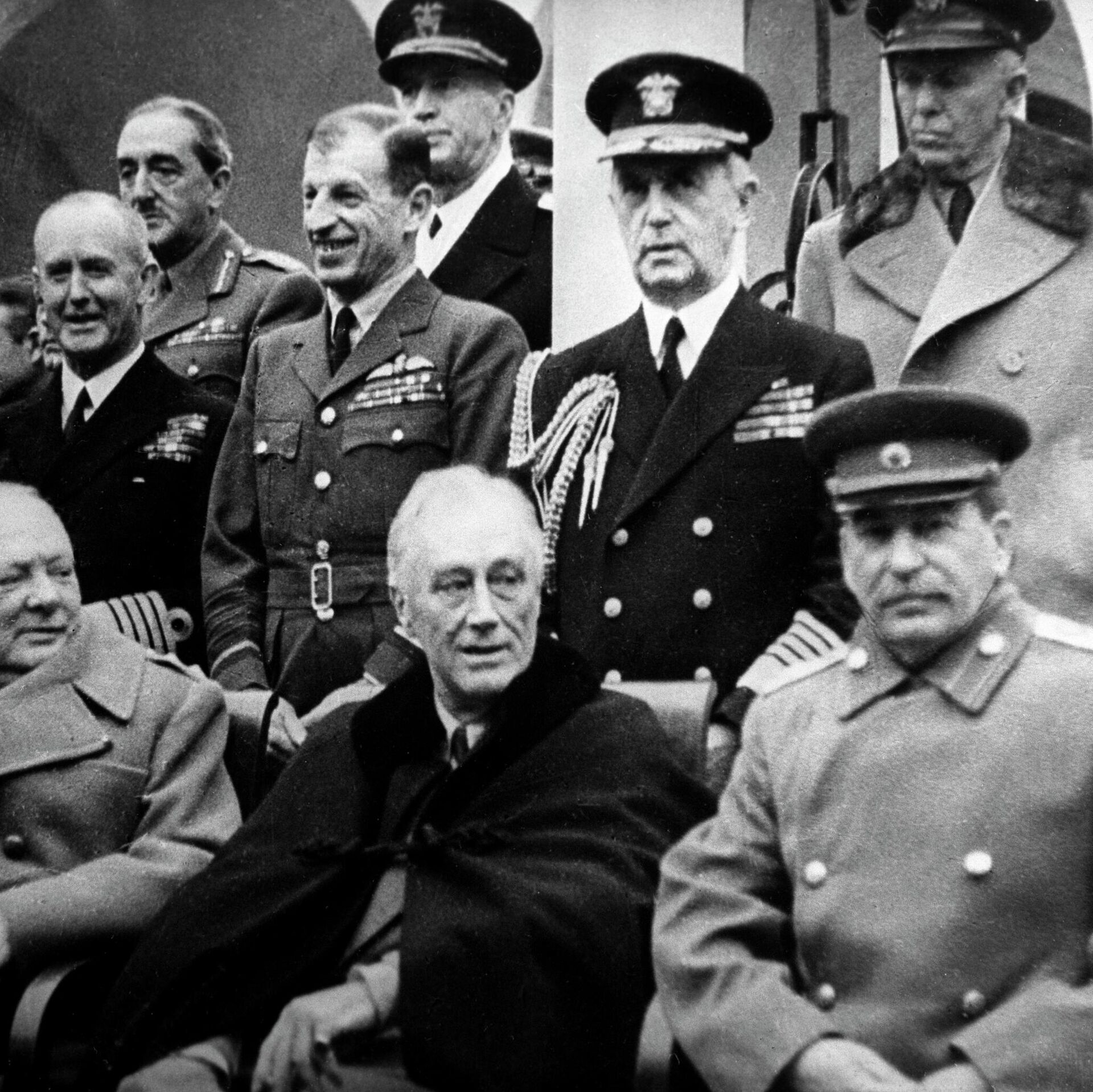 За круглым столом в первый день работы конференции (слева направо): заместитель наркома иностранных дел СССР Иван Майский, генсек СССР Иосиф Сталин, генерал Советской армии Алексей Антонов, генерал армии США Джордж Маршалл, начальник штаба президента США адмирал флота Уильям Леги и президент США Франклин Рузвельт