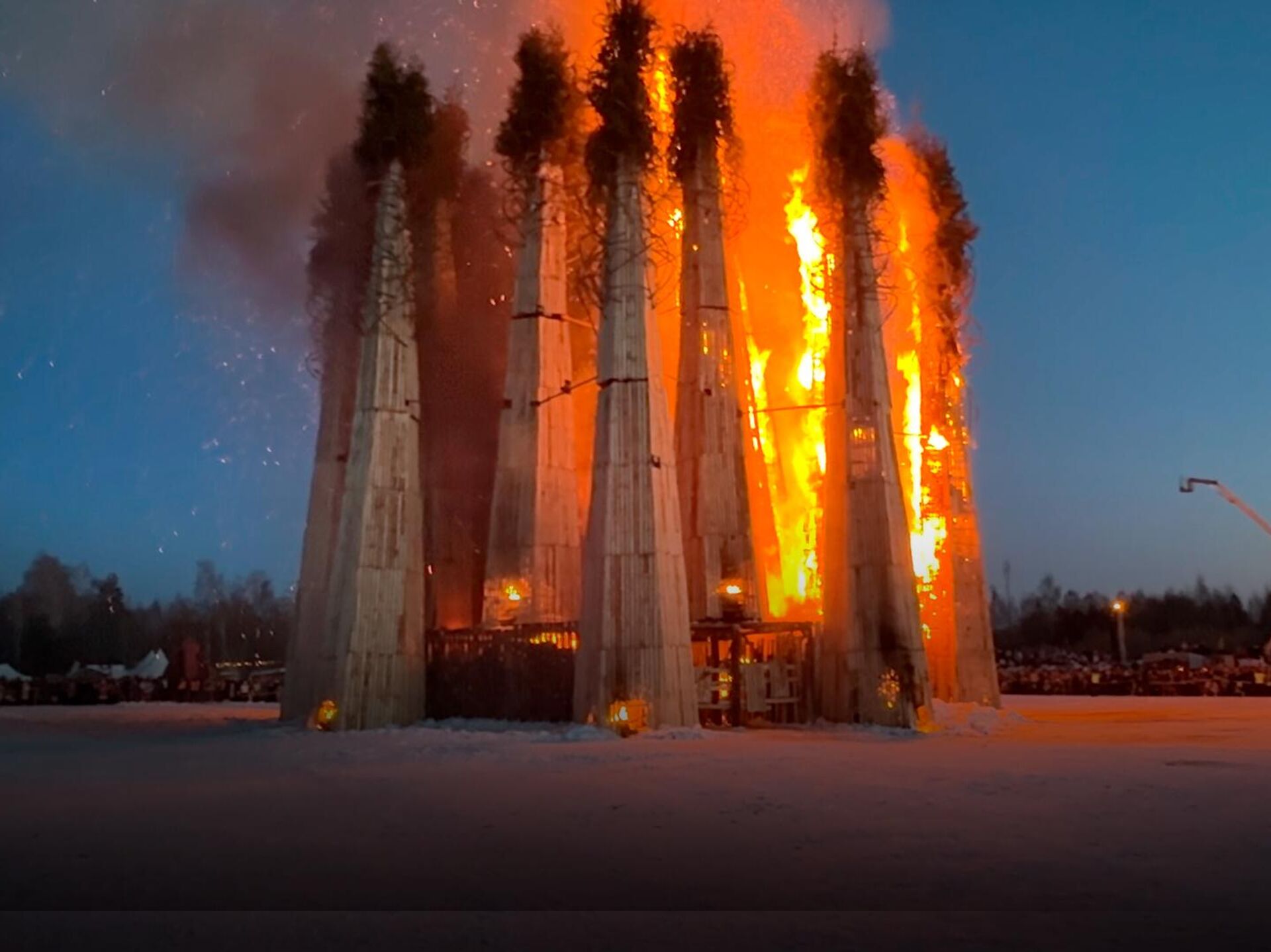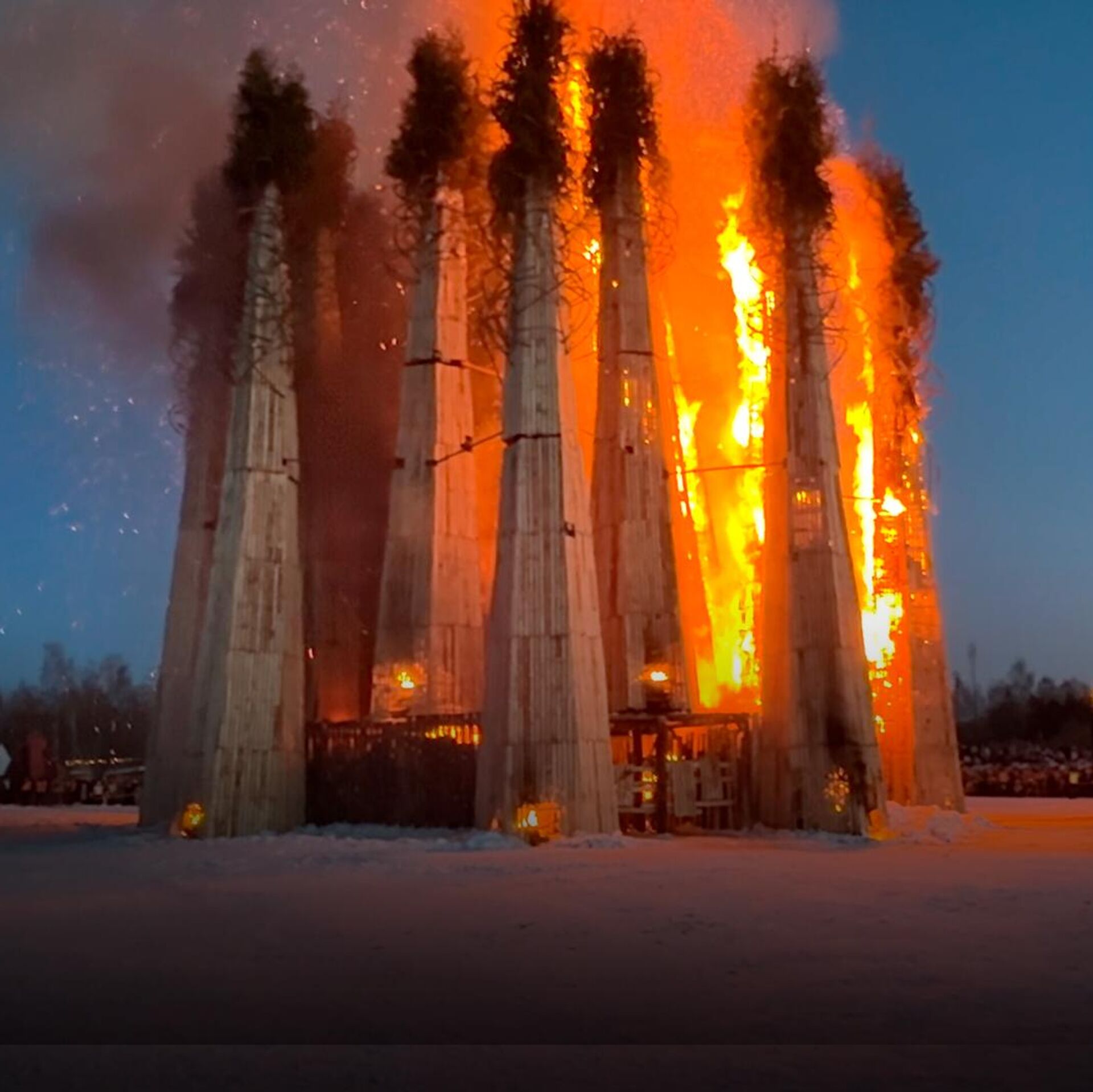 За прошедшие годы художник в своем парке создал множество арт-объектов, и часть из них – именно для сожжения на Масленицу. Это были Мельница, Вавилонская башня, Жар-птица, Байконур и много чего еще, а в этом году Николай Полисский построил инсталляцию "Горящее сердце". С отсылкой к Максиму Горькому и сердцу Данко.